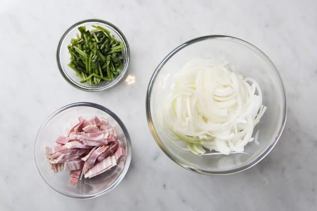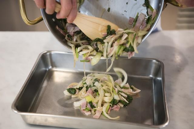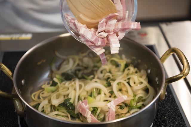 最後に1cm幅に切ったベーコンを入れる。後にオーブンで焼くので、芯まで火が入らなくてもOK。