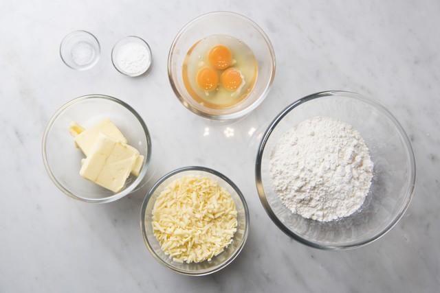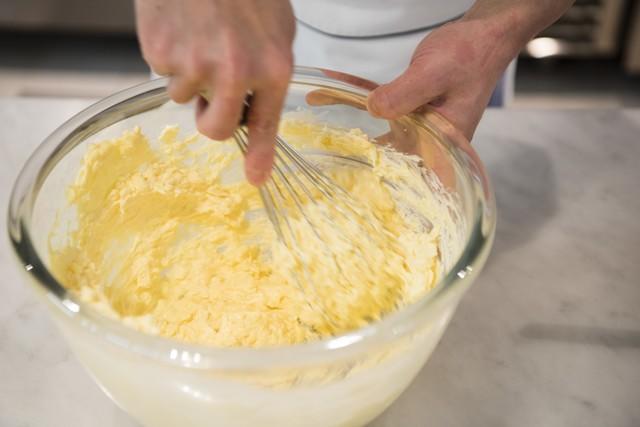 湯せんで溶かした無塩バターにグリエールチーズを入れ、混ぜる。そこにに全卵を1個ずつ入れて混ぜ合わせる。