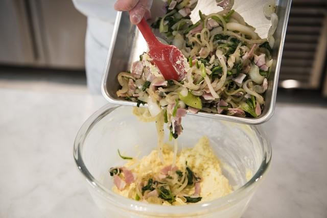 そこに、ふるいにかけた薄力粉とベーキングパウダーを入れよく混ぜる。粉物は、最初ゆっくり優しく混ぜること。その後、粗熱を取った具材を入れて混ぜ合わせる。