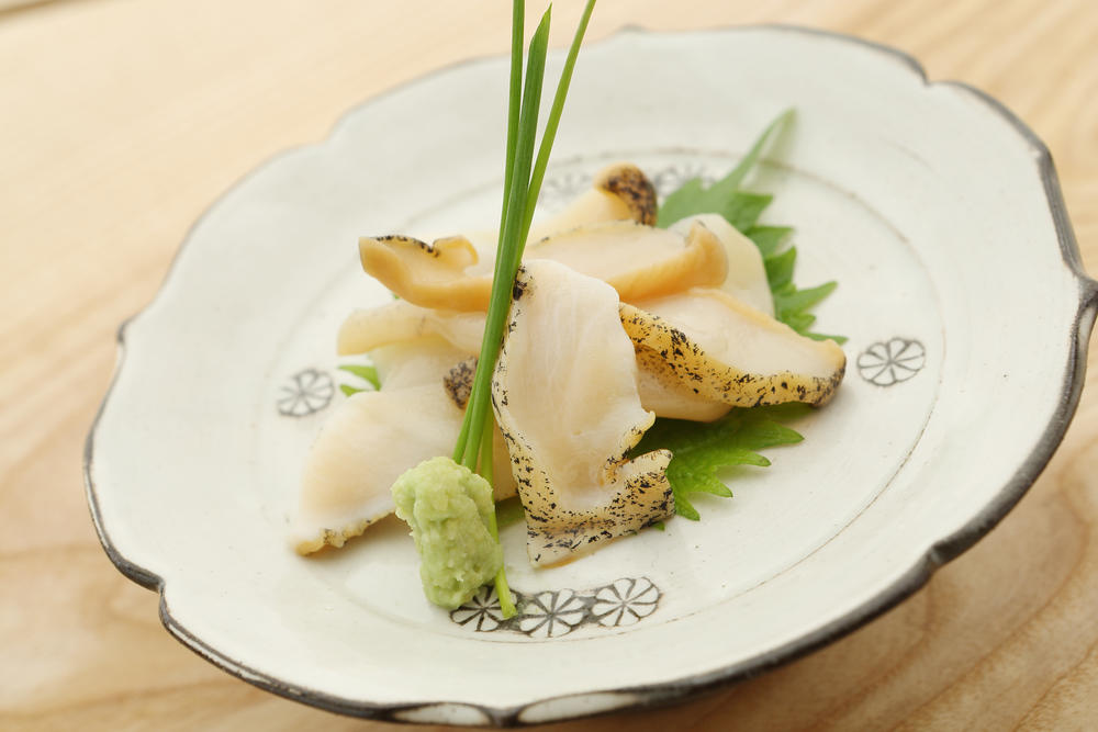 うす造りもオススメ。アワビは熱を通すとやわらかくなるので、コリコリとした食感が楽しめるのは、やはり刺身である。