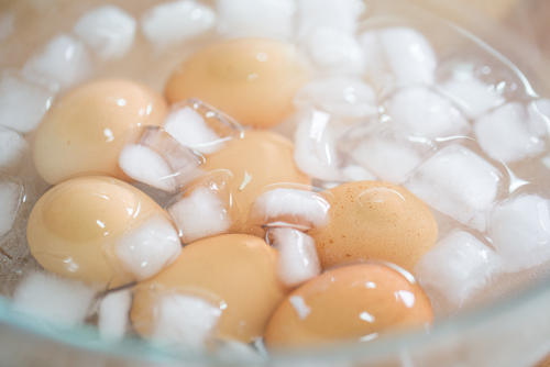 そして、好みの時間卵をゆでたあと、少しの間乾かしておき、氷を入れた水に一気につけて急速に冷やす。このとき殻にヒビを入れ、流水で洗うようにするとするっとむきやすくなる。