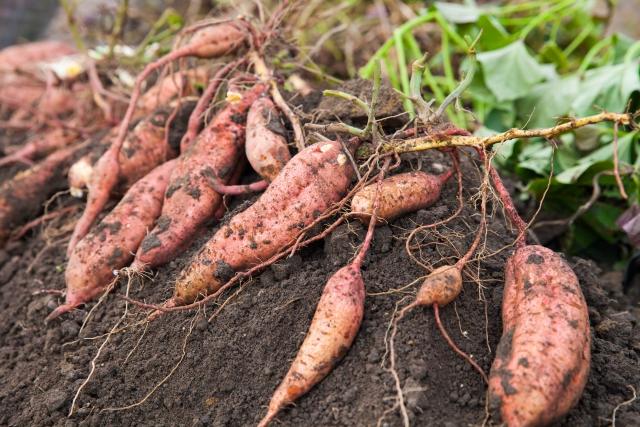 さつまいもの収穫は普通種で10月が旬なのだが、実は掘りたてより貯蔵後の方が甘みを増す。