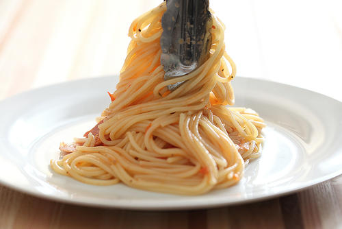 コツ①で皿の余白について学んだ。これだけでもぐっと美味しそうに見えるが、まだまだ工夫できる点がある。次に注意したいのが、高低差。パスタを盛り付けるよしよう。その場合は、トングなどで巻きながら高く盛り付けるのが正解だ。料理に限ったことではないが、のっぺりメリハリのない表情は、活気を与えない。高さと低さを意識して、バランスよく盛り付けよう。