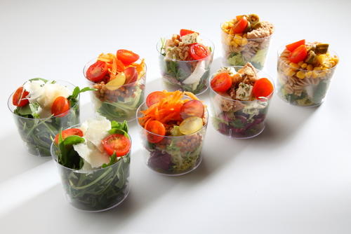 例えば、普段ボウルに盛り付けているサラダをグラスに盛り付けてみよう。これだけで雰囲気がぐっと変化する。こんな風に、盛り付ける器をアレンジするのも料理をより美味しく見せるテクニックの1つ。グラスは、中身が透けて見えるので、綺麗な色のスープなどを盛り付けるのにも向いている。