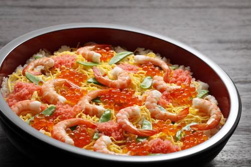 古くから祝い事のときに食べられてきた「ちらし寿司」には、絹さや・ごま・ニンジン・レンコン・刺身・干ししいたけなど「まごわやさしい」の食材が多く使われている。また「まごわやさしい」の食材ではないが、ご飯や卵(錦糸卵)などのようなエネルギーになる食材も使われている。