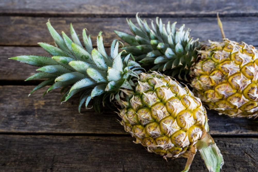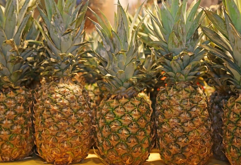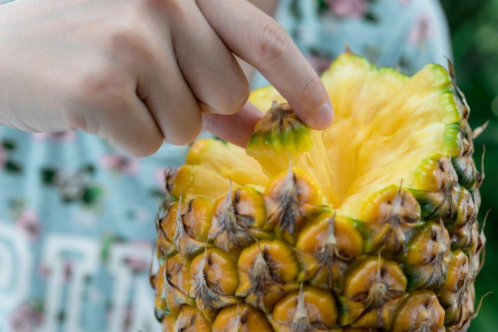 果肉全体の色は、黄色みを帯びているものが熟している。胴の部分が青々としているものは、まだ未熟で酸っぱい可能性が高い。パイナップルは追熟しないので、青いものを置いておいても青いままで、さらに熟することはない。ゆえに、選ぶ時が肝心なのだ。