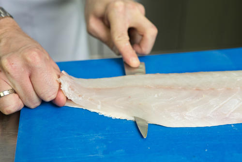 (5)細かい骨が多い腹骨の部分を、包丁で切り落とす。