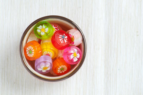 今でこそ日常菓子として楽しめるが、干菓子は元々お土産むきのため、細工に凝る傾向にあった。落雁(らくがん)などは繊細な型にきな粉や栗粉と砂糖を押しつけて蒸気を当て、そっと取り出して乾燥させたもの。金平糖も飴細工も、昔はその手間と繊細さから高級品だった。砂糖を用いない豆菓子や煎餅、あられ等は昔から庶民の味方だったようだ。