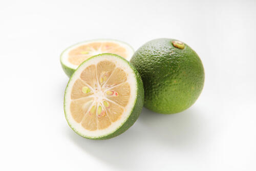 ハウス栽培は4~8月中旬、露地栽培は8月中旬~10月中旬、冷蔵で貯蔵したものは10月中旬~3月にかけて出回るため年中入手しやすい。ゴルフボールほどと小さく、重さは1個40g程度である。かぼすと同じゆずの近縁種で、さわやかな香りやほどよい酸味があるのが特徴だ。利用されるのは主に絞り汁である。成熟すると皮がオレンジ色になるが、出回っているもののほとんどは緑色の「未熟果」と呼ばれるタイプであり、香りは未熟果の方がよい。