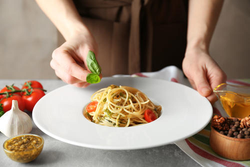 パスタはお皿に全体にベタッと広がってしまいがちになるので、盛り付けの三原則の「高さ」を出すためには、ちょっとしたコツが必要となる。