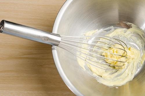 - ボウルを氷水で冷やしながら、冷えた生クリームを角が立ち黄色っぽくなるまで泡立てる。