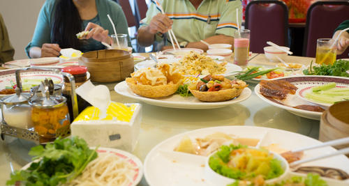 - 器は持たない...汁物でも器を持たずレンゲを使う。麺類は箸でレンゲに麺を入れ、音を立てず汁が飛ばないよう食す。料理を取り分ける時も手に持たない。