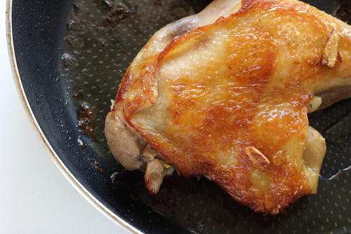 フライパン調理は火加減の調節が肝心となる。鶏もも肉を綺麗に焼くコツは、強火で焼かないことである。強火で焼くと肉の細胞が縮み、旨味と水分が外に逃げていってしまうからだ。フライパンは温めずに、冷えたフライパンに油と鶏もも肉を入れてから火にかける。そして弱火でじっくり焼き上げていくことで、肉の表面がパリッと焼けるのである。