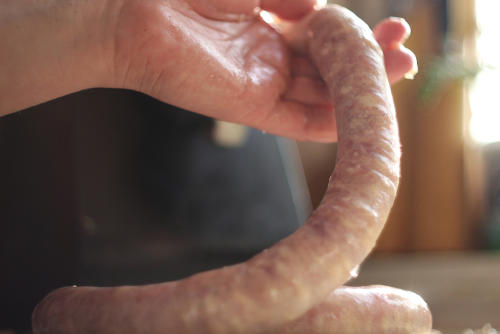 次に出来上がったソーセージを適当な長さにねじるのだが、普通にねじるだけだと茹でた際にほどけてしまう場合がある。そのため、まずは腸詰したソーセージの真ん中を何度かねじり、半分に折り曲げ、ソーセージが二本できた状態にする。次にそれを二本ごとねじって輪を作り、片方をできた輪の中に通せば、茹でてもほどけないしっかりとしたソーセージが出来上がる。
