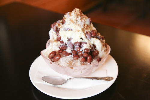 最近では「沖縄風ぜんざい」とよばれることも多い沖縄特有のぜんざいは、砂糖や黒糖で甘く煮た豆と押し麦がトッピングされたかき氷を指すことが一般的なのだ。店やメニューによっては、白玉団子が添えられていることもある。