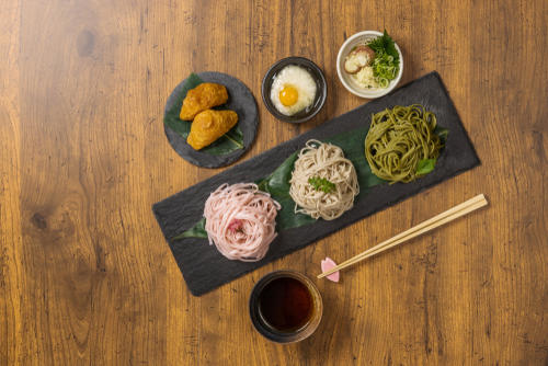 更科粉に様々な素材を練り込んで打ったそば。柚子、芥子、紫蘇、菊など、季節それぞれの趣を楽しむもの。 - 茶そば