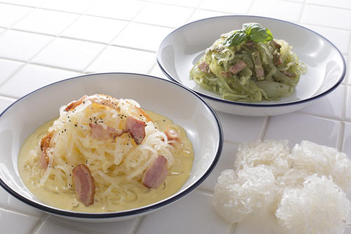 酢の物で和えるのもよい。麺として使うのであれば、冷やし中華のスープと具材でしらたきを食べると、ヘルシーに「冷やし中華」を楽しむこともできる。