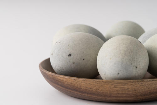 きれいに洗った後は、ゆで卵と同じように殻を剥く。卵の一部にヒビを入れてから、親指で軽く押しながらヒビを全体に広げるようにすると剥きやすい。殻を剥くとゼラチン状に変化した、あのなんとも言えない黒い白身の部分が顔をだす。