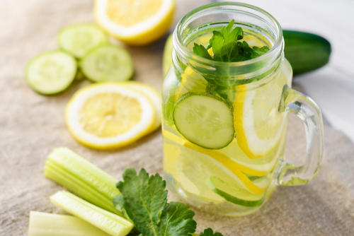 材料はセロリ、きゅうり、レモン。セロリは洗って茎と葉を分け、茎は3~5cmくらいのスティック状に、葉は粗いざく切りに。きゅうりとレモンは洗って薄くスライスする。ミネラルウォーターや蒸留水に材料をすべて入れ、冷蔵庫で3時間以上冷やせば完成。