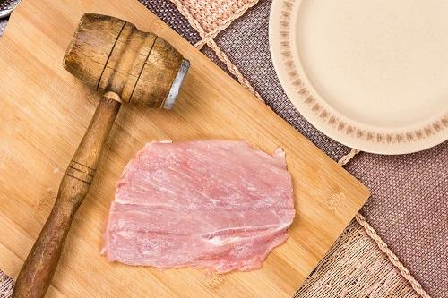 より肉を柔らかく仕上げるのであれば、肉全体に筋切りを施すと良い。さらに、包丁の背で肉を軽く叩き、筋肉の繊維を壊しておくと、焼き上がり柔らかくなる。肉叩き器などで軽く叩いても良いだろう。