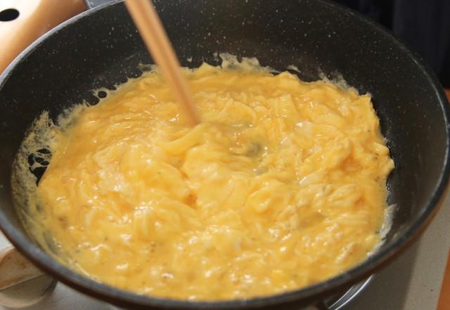 まわりが少し固まってきたら、固まった部分をまんべんなくほぐすように10回ほど菜箸でかき混ぜる。このときのポイントは「大きく」「ゆっくり」。ふわふわの半熟スクランブルエッグになったらすぐに器に取り出す。フライパンに入れたままにしておくと余熱で卵が固くなってしまうので注意。