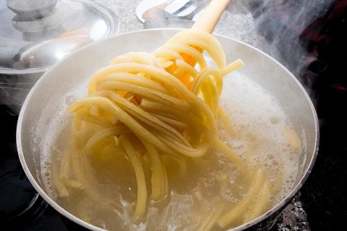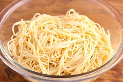 スパゲティを茹でる時間は、袋の後ろに書いてある表示通りでOK。通常は、ソースに絡めたり炒めたりする時間を考慮に入れ、表示より短い時間でザルにあげるのが一般的だが、麺を水で洗って硬さをキープする場合は、ちょうどいい茹で加減でいい。