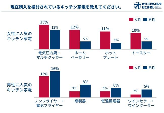 「現在 購入を検討しているキッチン家電」をたずねたところ、女性は「電気圧力鍋・マルチクッカー」が、男性は「ノンフライヤー・電気フライヤー」がもっとも多かった。電気圧力鍋のほか、女性が男性よりも購入したいと考えていたのは、ホームベーカリー・ホットプレート・トースターなどだった。一方、ノンフライヤー以外で購入意欲のある男性が多かったのが、低温調理器・燻製器・ワインセラーだ。