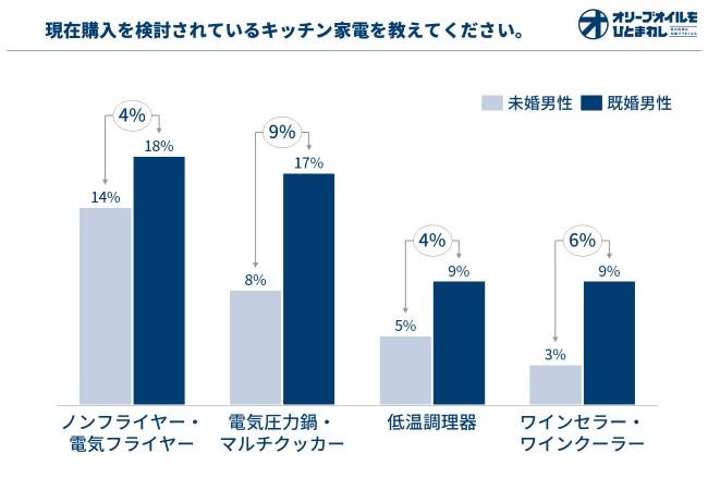 興味深いことに、男性が購入したいと思うキッチン家電は、既婚者と未婚者で大きく異なることが分かった。ノンフライヤー・電気圧力鍋・低温調理器・ワインセラーは既婚男性がより好むことが多く、電気ケトル・コーヒーメーカー・トースターは未婚男性の方が購入を検討しやすいようだ。女性の場合は、既婚者と未婚者の差は男性ほど大きくない。
