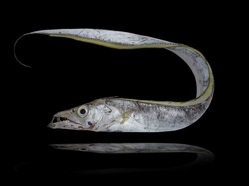 4歳で80cmほどになり、最大で1.5mほどに成長。銀白色で平たく長い帯状で、背ビレが長く全身に行き渡る。海蛇のようにくねくね泳ぐが、餌を捕獲するときは立ち泳ぎも。イカなどをエサとして食べる肉食で、歯が鋭い。肉は白身で淡泊、加熱すると旨味が増す。脂肪量がタンパク質より多く、ミネラル豊富で栄養価も高い。 - 天竺太刀