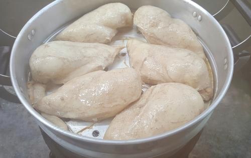 ・両面に塩をまぶし、鍋にむね肉、水、酒を入れ中火にかける。沸騰したら弱火にし、3分茹でる。裏返して蓋をし3分茹で火を止め、余熱で火を通す。