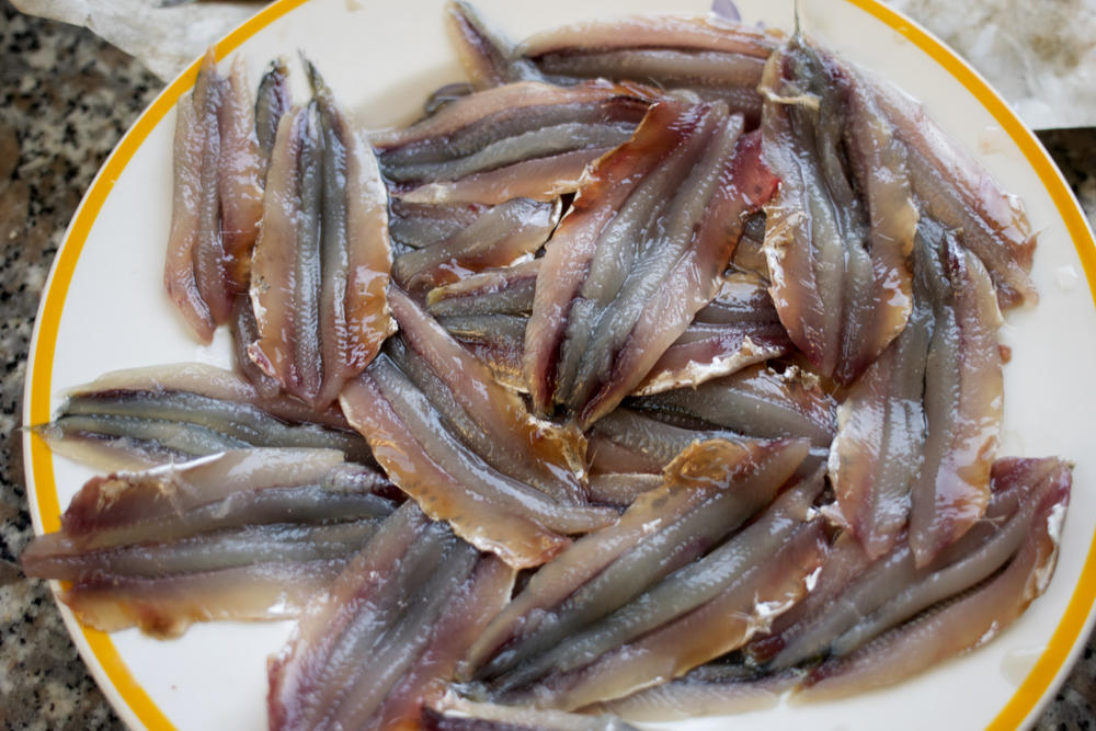 7. 開けたら、中骨を取る。尾に近い骨を折ってから、頭の方に向かって剥がしていけば、簡単に外せる。