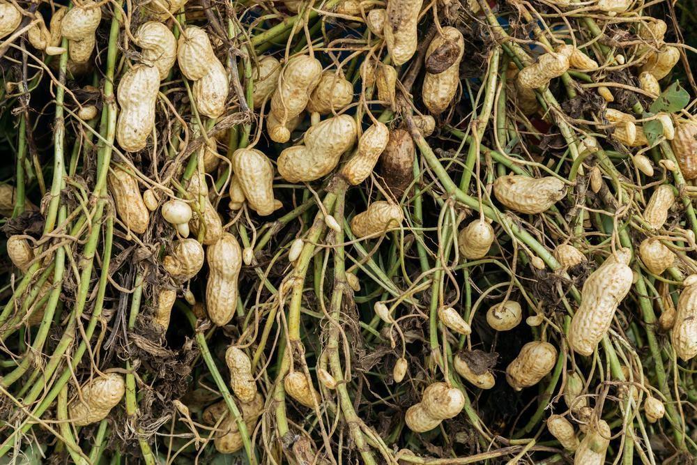 ピーナッツの種蒔きは、たいがい5月中旬~6月にかけて。9月下旬~10月にかけて収穫時期となり、掘り上げた株は畑で1週間ほど地干しされる。その後円筒状に積み上げて自然乾燥し出荷される10月ころがピーナッツの新物の旬となる。
