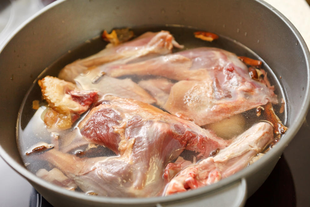 手順としては、鴨のモモ肉に塩と砂糖を揉み込み、一晩寝かせる。鍋にラードの油を入れて80℃程度に温め、そこに鴨肉を投入。油の量は肉がひたひたに隠れるくらい。油の温度を80℃にキープしたまま1時間~2時間じっくり火を通す。肉が柔らかくなったら火を止めて冷ませば出来上がり。
