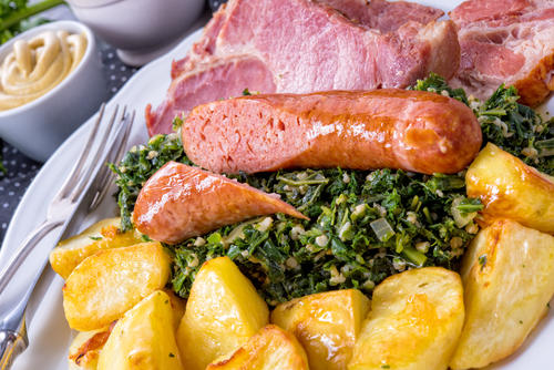 作り方としては、ケールを刻み塩で茹でる→小口切りの玉ねぎと人参、ベーコンを鍋で炒める→ケールを入れて一緒に炒める→ひたひたの水を入れて蓋をして30分ほど煮込む→ソーセージを入れ、さらに煮込んで完成。茹でたじゃがいもやマッシュポテトとマスタードを添えていただく。