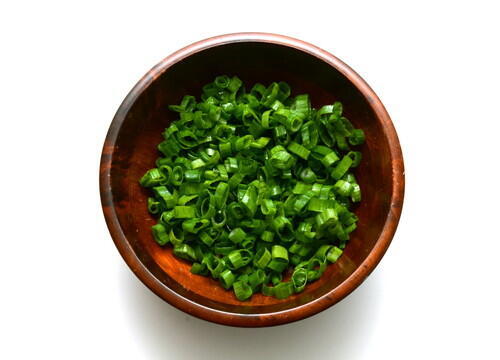 小口切りにした青ネギ(万能ネギ)は薬味として重宝する。万能ネギなど、細いネギであれば複数本をまとめて切ることが可能だ。