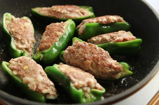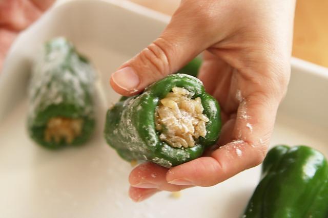 ピーマンに詰め物をして調理する際、詰め物が剥がれたり抜けたりしにくくするには、まず内側に片栗粉を振ってからタネを詰めるのがポイントだ。片栗粉の主成分であるでんぷんは、加熱すると水分を吸って膨張し、ゲル状に変化することで、のりのような役割を果たすのだ。