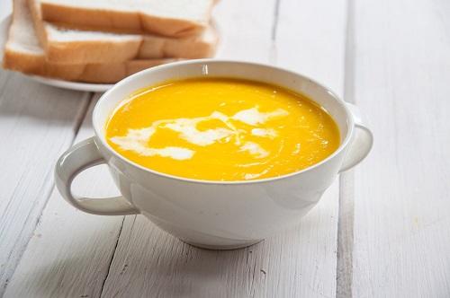 ポタージュは、玉ねぎのみじん切りを炒めて水と固形スープの素を入れて煮た後、かぼちゃのペーストと牛乳を加え、味を調えれば完成。水の量で濃さを調節しよう。