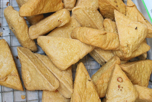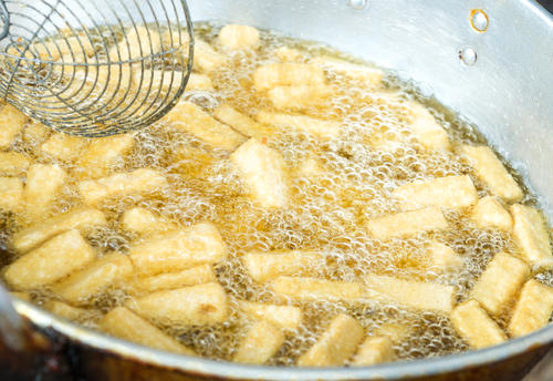 油揚げと厚揚げは両方とも作る工程はほぼ同じだが、油揚げは低温、高温と2回揚げるのに対し、厚揚げは高温で1回揚げるのみ。厚揚げは中が豆腐のままであるが、油揚げは網状となり、調味料などを吸い込みやすいのが特徴だ。