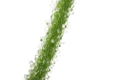 植物は光合成でエネルギーを得ているが、日中の光合成は「蒸散」といって水分を消費してしまう。このため、アイスプラントは通常の光合成の他、日中ため込んだ二酸化炭素を夜に代謝する「CAM型光合成」という夜間光合成回路を持っている。また、葉の表面のキラキラした袋状のものは「ブラッター細胞」という。塩分その他のミネラルをここに貯蔵し、厳しい暑さに耐えているのだ。