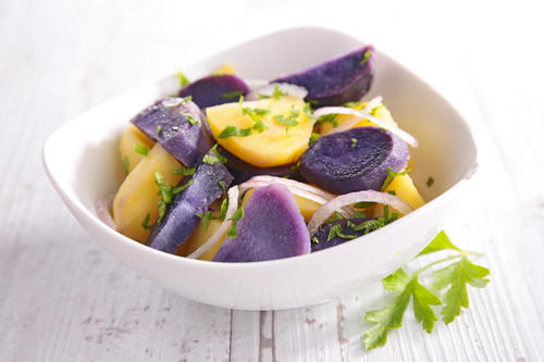 紫色は加熱で薄くなるが、冷やすと鮮やかさが戻るので、ポテトサラダやマッシュポテトに最適だ。クリーム状に練って飾りにするのもむいている。また、炒める・揚げる料理はシャドークイーンと相性がよく、美味しくきれいに出来上がる。加熱は「蒸す」と水による色落ちが少ない。電子レンジは蒸すのと同じ効果なので、水にぬらしてラップにつつんでレンチンでもOKだ。