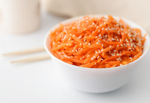 細切りのドライ人参を熱湯で戻し、ザルで水分を切る。人参が熱いうちに、炒り胡麻、胡麻油、鶏ガラスープの素、醤油、ニンニクペーストと合わせたら完成。香りも高くコリコリの食感が楽しいので、人参好きにはたまらないだろう。