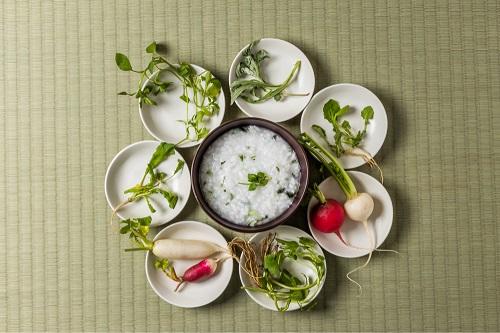 人日(じんじつ)の節句に7種の新芽を食べて邪気を払い、野菜不足を補って健康に。また正月中の飲みすぎ・食べすぎで疲れた胃を休める、という意味も。