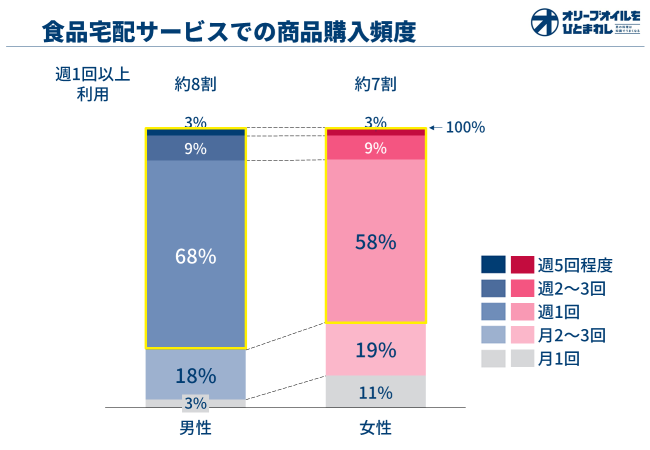 食品宅配サービスを利用する男性は、女性よりも高い頻度で商品を購入している。男性からの食品宅配サービスの認知度は高くないため、サービスの利用者は少ないものの、一度利用し始めた男性は女性以上に積極的に商品を購入するようだ。