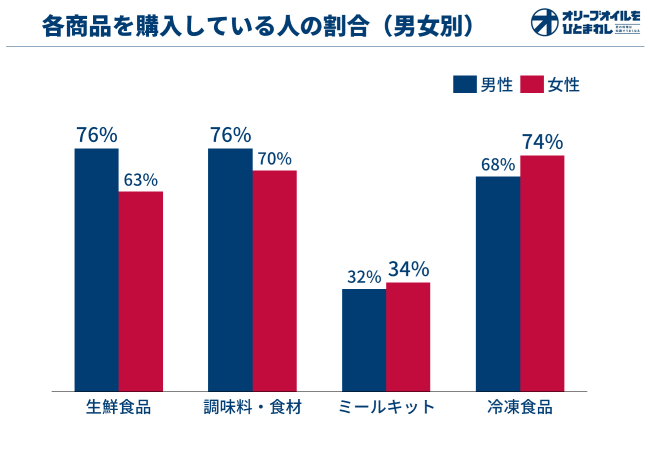 食品宅配サービスの認知は、男性の間では十分に広がっていない。そのような状況で既にサービスに登録している男性となれば、活用方法を吟味したうえで利用し、より積極的に商品を購入しているようだ。