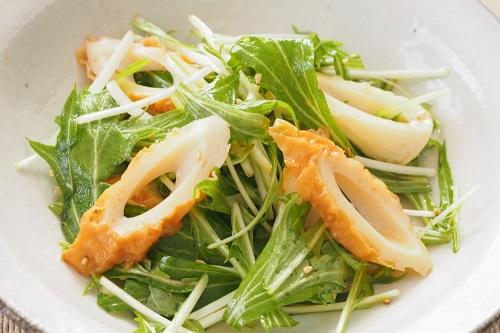 ちくわと一緒に和えるものに特に決まりはないが、水菜が特におすすめ。ちくわを幅5mmくらいの細切りにし、5cmほどに切った水菜を加え、市販のゴマドレッシングとマヨネーズを半々で和える。最後にすりゴマを加えればできあがり。レモン汁を加えると、夏向きの爽やかな味になる。また、具材は大根やキュウリ、セロリの千切りでも旨い。