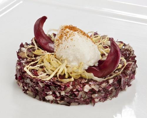 チコリの仲間ゆえに味は似ていて、キク科独特の爽快なほろ苦さと風味があり、サクサクとした食感は、ちょうどキャベツとレタスの中間といえるだろう。ワインレッド色の葉に真っ白い葉脈が入り、大変美的な野菜である。