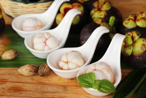 マンゴスチンの果肉は木のような材質の果皮に覆われており、この果皮をむいて中にある真っ白な果肉を食べる。5月~9月頃の旬の時期には生のマンゴスチンを食べられるが、旬以外の時期には冷凍ものが流通している。そして、さまざまな加工品も商品化されている。例えば、ジュースやゼリー、ガム、ドライフルーツ、ジャム、缶詰などだ。今でこそ日本でも生のマンゴスチンを食べることができるが、少し前までは輸入が禁止されていたため、冷凍や缶詰などでしか食べることができなかった。マンゴスチンの加工品はタイなどではお土産としても人気が高く、特にドライフルーツはお土産ランキングで常に上位にランクインしている。