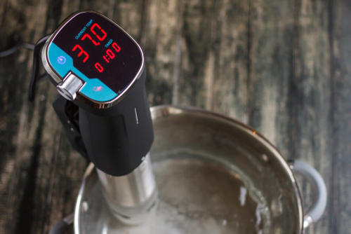 次は、鍋を使って低温調理する方法について紹介しよう。準備するものは、鍋と温度計のみ。深めの鍋にお湯を沸騰させ、その中に食材を入れる。数分経ったら火を止めて、余熱で火を通す。そのときの温度は温度計で測りながらできるだけ一定に保てるようにするといいが、外気温や食材によってはどうしても温度が下がりやすくなってしまう。温度が下がると食中毒を引き起こす危険性も高まるため、衛生面で注意が必要な方法だ。