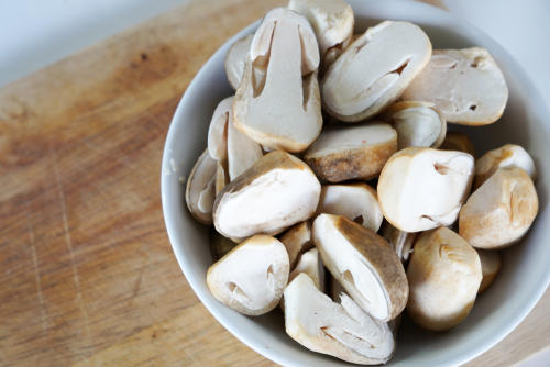 ヘットファーンとは、日本ではふくろたけと呼ばれているキノコのこと。しいたけ、マッシュルームと並んで、世界三大栽培キノコともいわれている。グレーがかった卵形で半分に切ると中にキノコのカサが折りたたんで入っているような形状から、フクロタケと呼ばれるようになった。原産は中国である。タイはもちろんのこと、東南アジアではとてもポピュラーな存在だ。ちなみに一般的なキノコが朽ちた木などに発生するのに対し、フクロタケは土に埋まった枯れ草に発生する。人工栽培の場合は、藁が使用される。培養に適した温度は30~35℃と高く、PHを管理する必要がある。