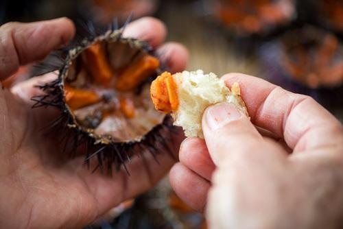 ウニは棘だらけの殻に包まれており、その中からオレンジ色の身を取り出す必要がある。代表的なウニの種類「バフンウニ」も「ムラサキウニ」も割り方の基本は同じである。
